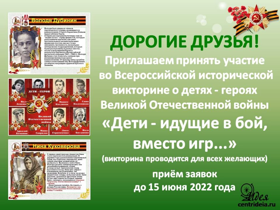 Ссылка викторины https://centrideia.ru/node/vserossiyskaya-istoricheskaya-viktorina-o-detyah-geroyah-velikoy-otechest...