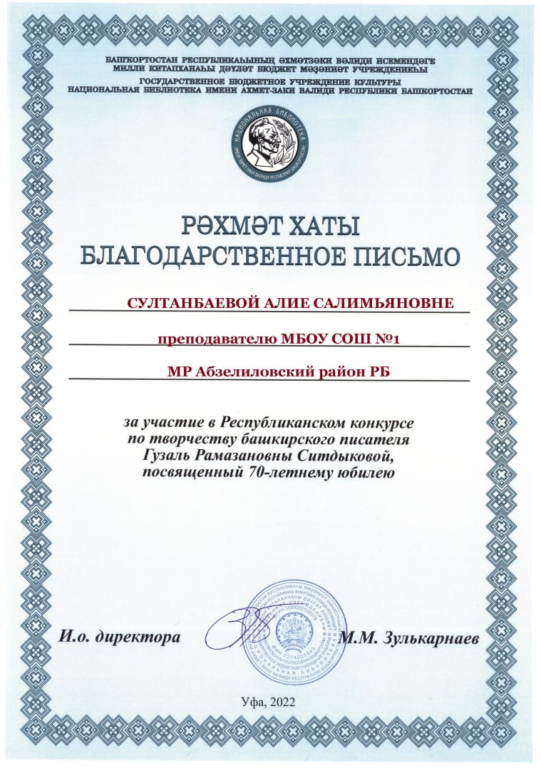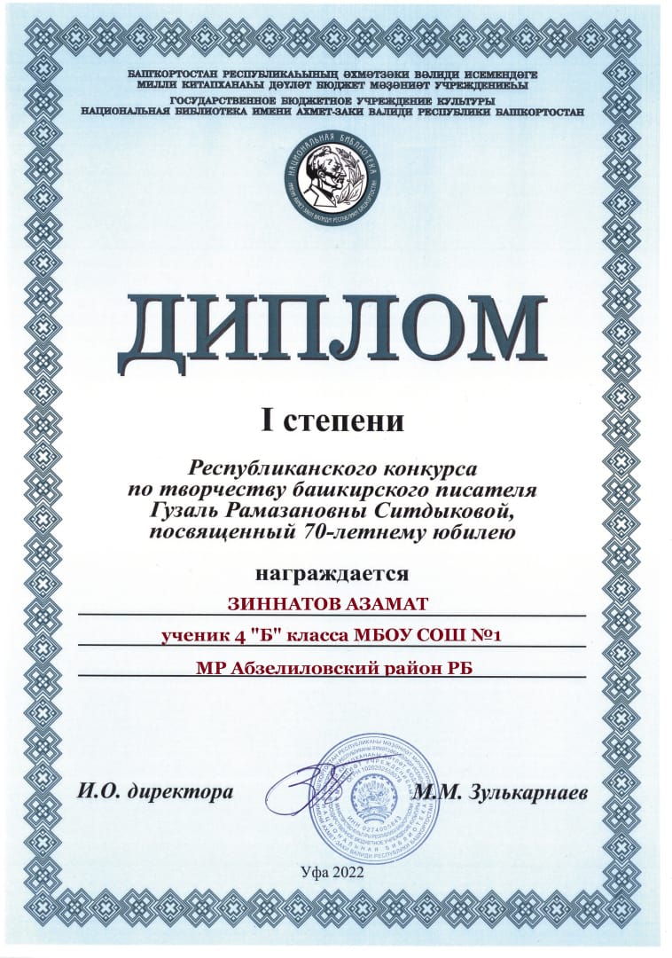 Поздравляем ученика 4Бкласса Зиннатова Азамата дипломом I степени! Республиканский конкурс башкирского писателя Гузаль Рамазановны Ситдыковой, посвященной 70летнему юбилею.